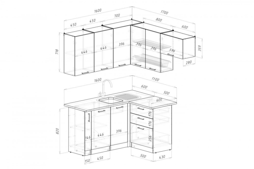 Ширина: 1600*1700 мм; Глубина: 600 мм (со столешницей)
